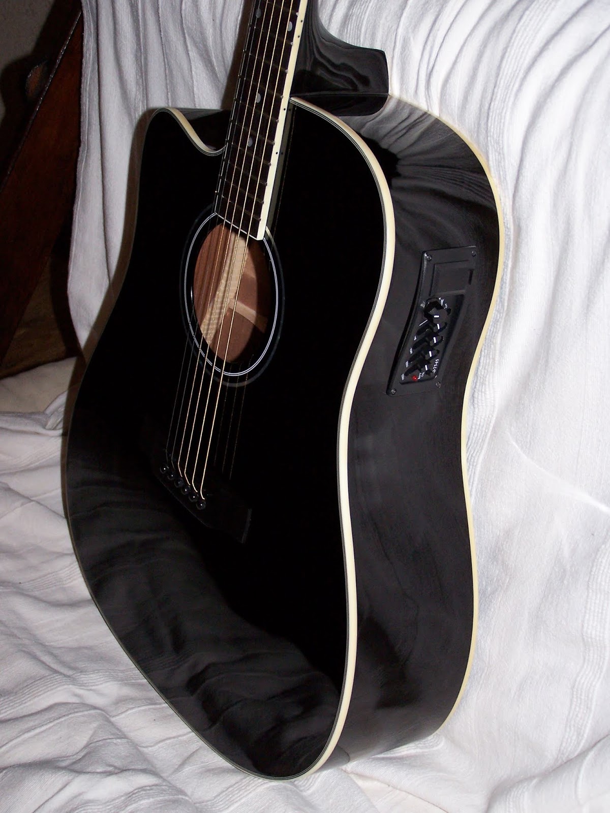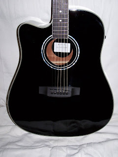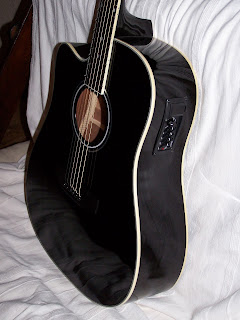 Sur cette photo ,on voit le changement des chevilles par encore du noir ,le sillet de chevalet qui a noirci lui aussi ,et la personnalisation à l'intérieur de la caisse sur fond ??? noir ,bravo ! Et ce qu'on ne voit pas ,et ben ,la prise jack noireu et les strap-locks obscurs eux aussi ...