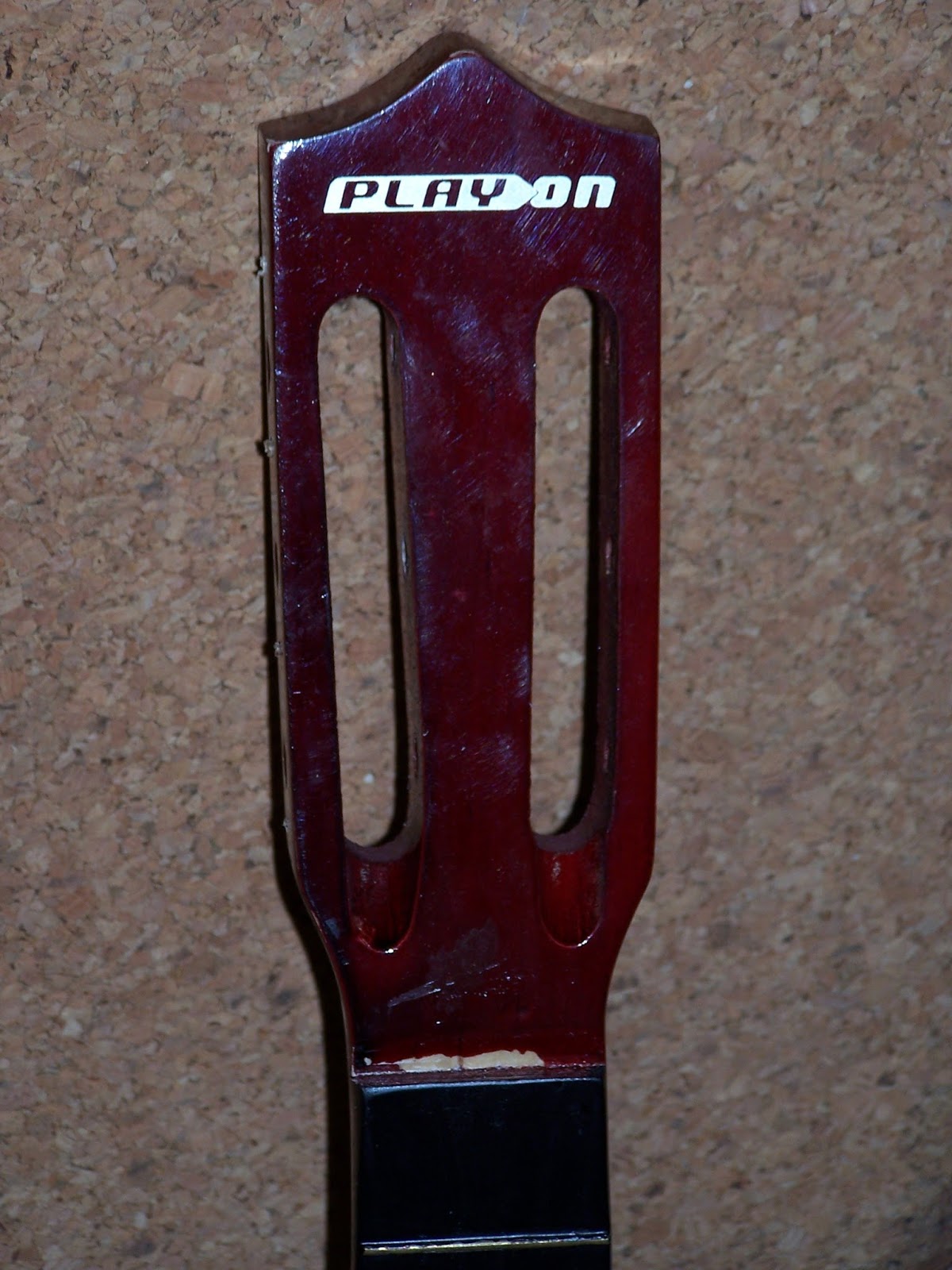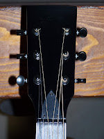 Evidemment ,aprés déballage ,et aprés maintes cogitations aussi ,fallait que je la bidouille à mon goût .Alors allez hop ,recoupe de la tête toute droite et suppression du logo au passage par peinture ,changement des mécaniques chromées par des toutes noires ,peinture du sillet de tête en noir dans la lancée , ajout d'un cache truss-rod noir ,et comme vous l'avez deviné ,on avance tout doucement vers un relooking "toute de noir vétue " à la Zorro .Les cordes aussi ont été changées ,mais je n'en ai pas trouvé de noires (snif) ,j'ai donc pris des Martin Médium ,et tant pis.