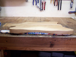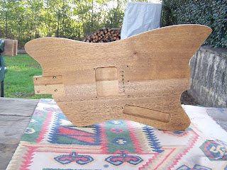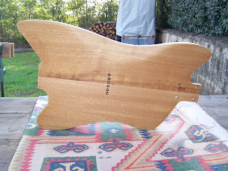 Et hop !!! Détourage fini ,neck pocket OK , réglage du diapason réglé ,perce des vis de manche ,défonce pour le micro unique et perce des passages pour les cordes et emplacements pour les férrules façon Télécaster !!! Et toujours du ponçage ...