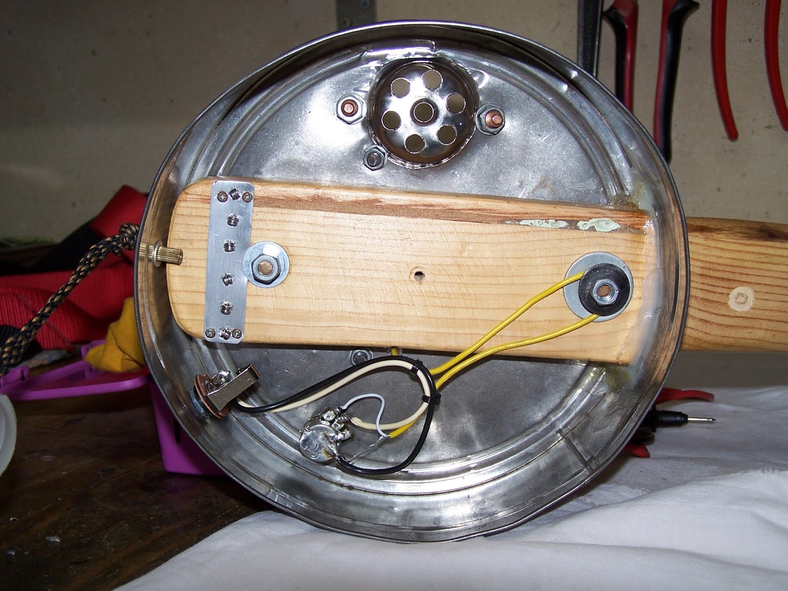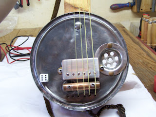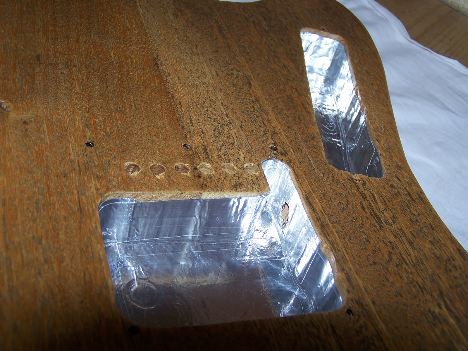 Ici ,blindage des cavités micro et électronique au scotch alu .On aperçoit aussi le petit trou reliant les deux défonces pour permettre le passage des fils du micro à venir ...