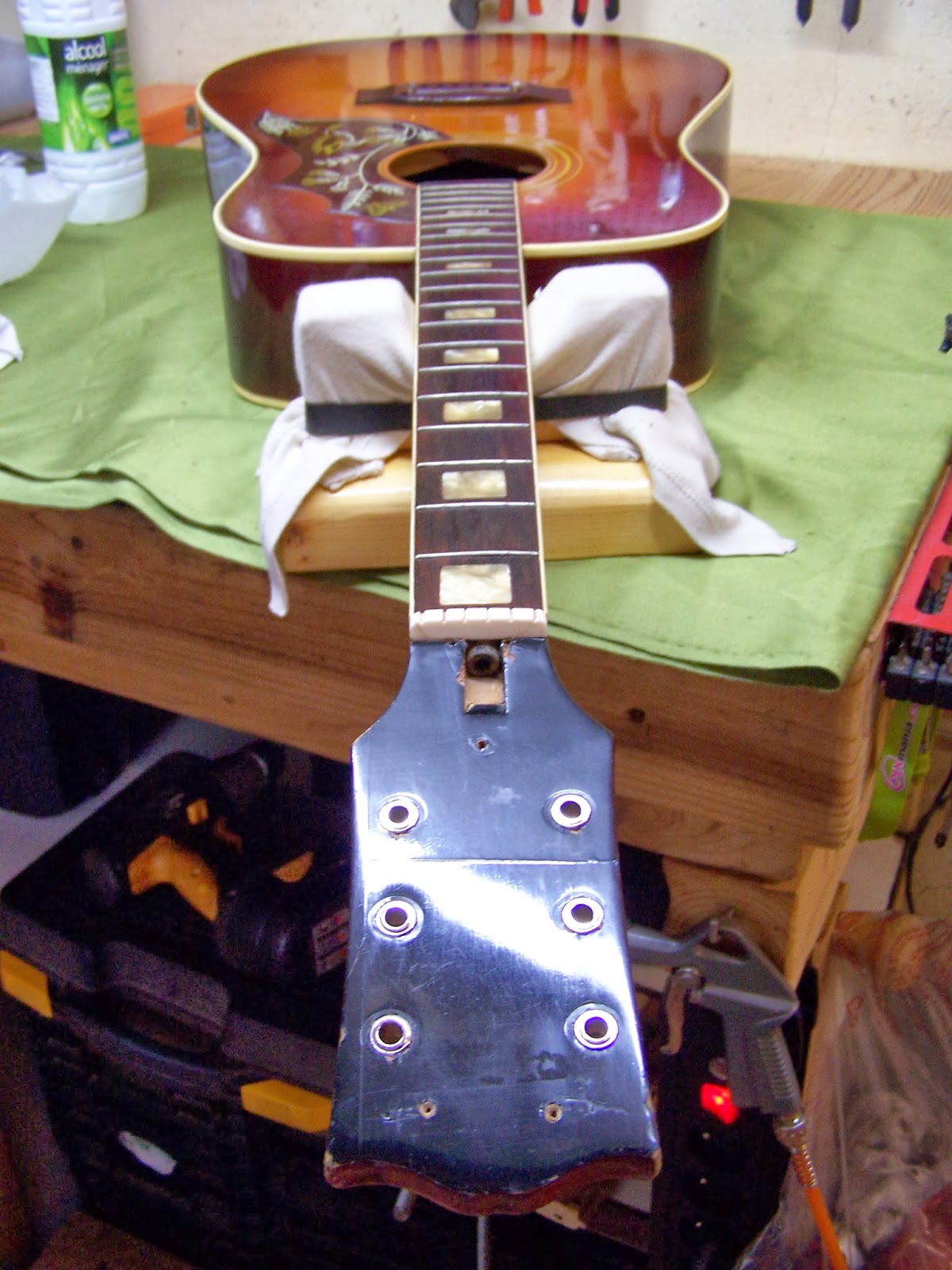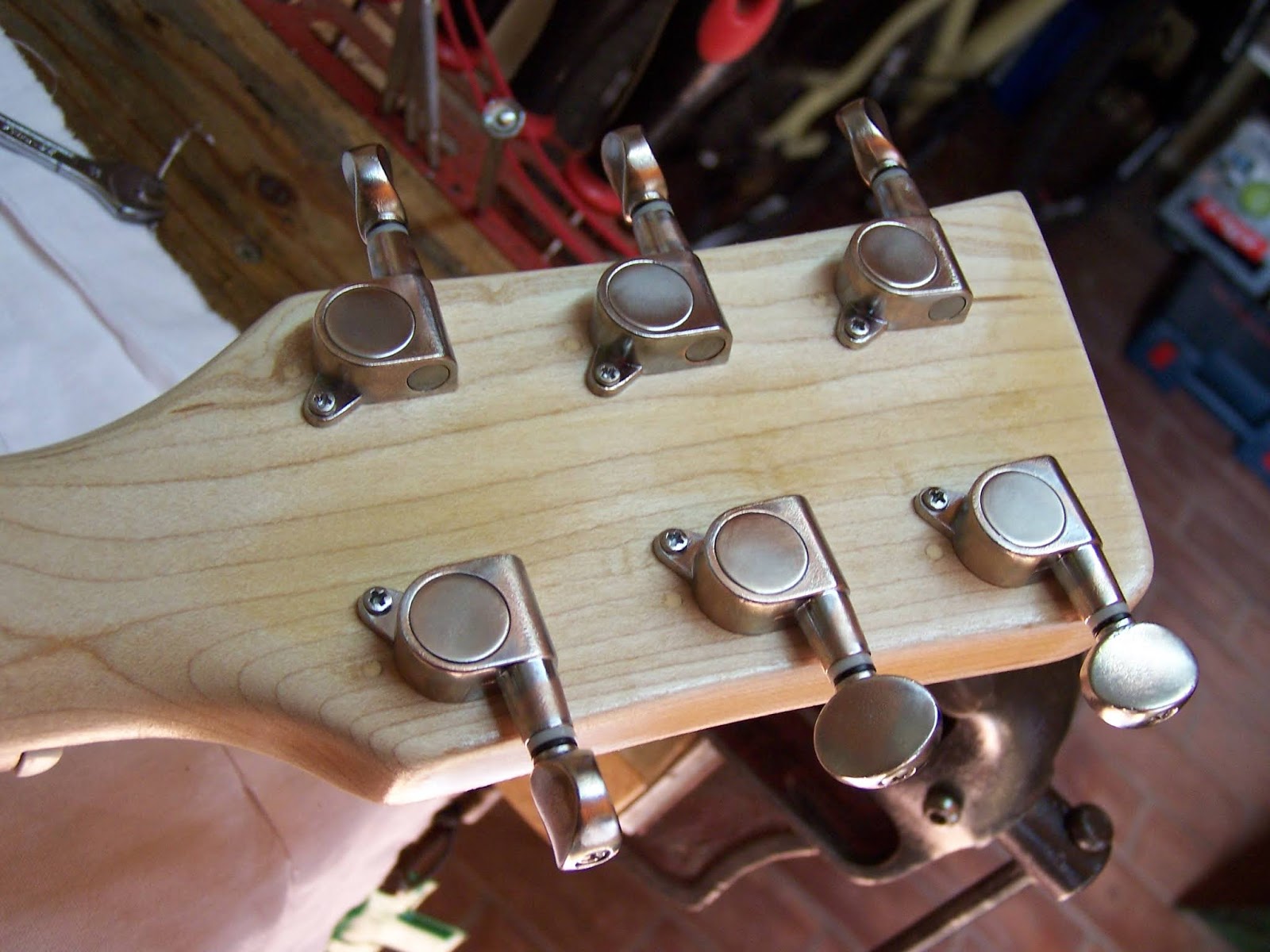 Bon ben,comme d'habitude,pour commencer,gros nettoyage-dépoussiérage,dépose du gros logo Sakura de tête,démontage du cache truss-rod pas à mon goût,et des mécaniques pas dans le style...On voit ici les nouveaux oeillets de mécaniques adaptés au diamétre de 10 mm de l'ancien perçage...