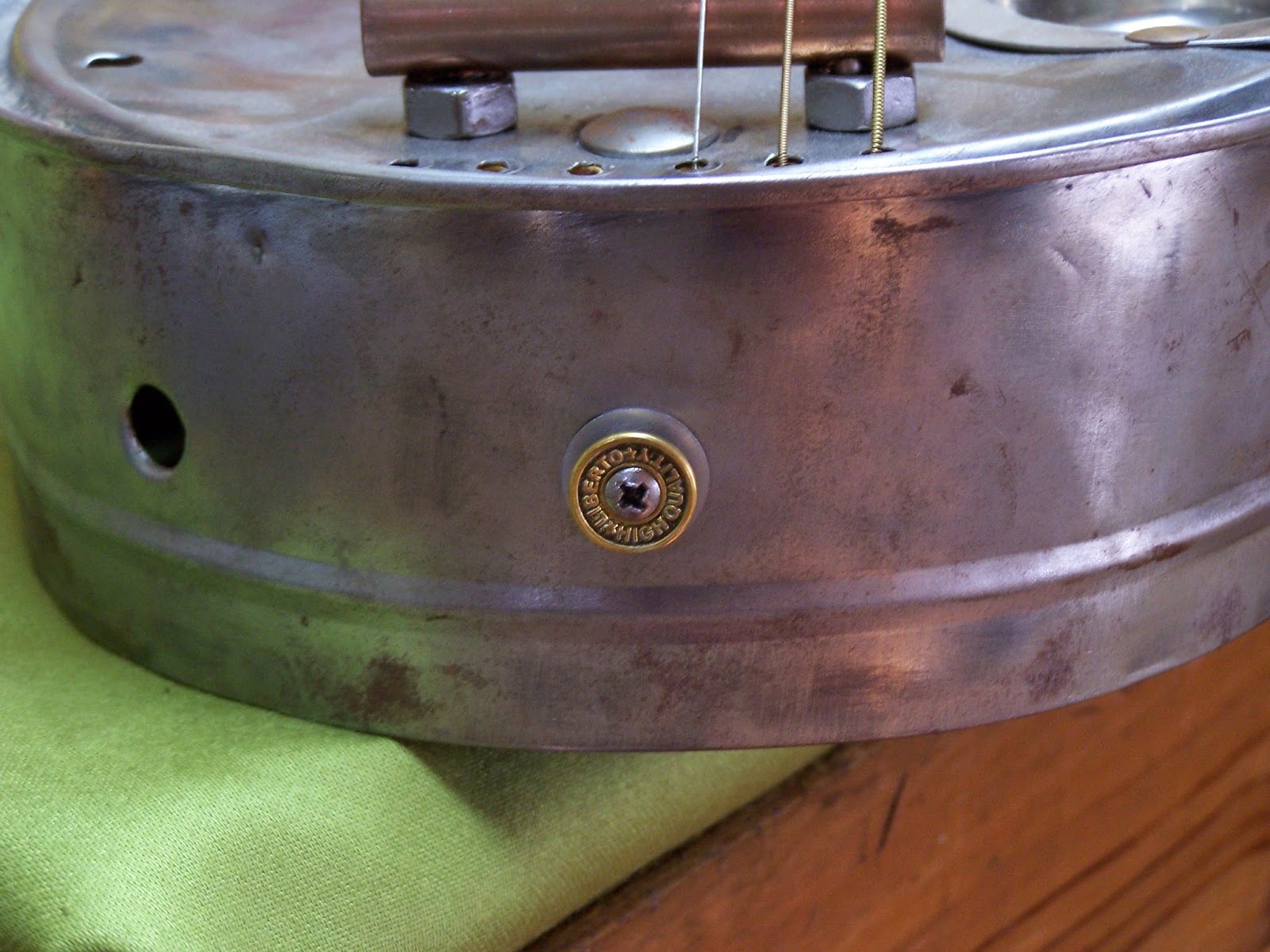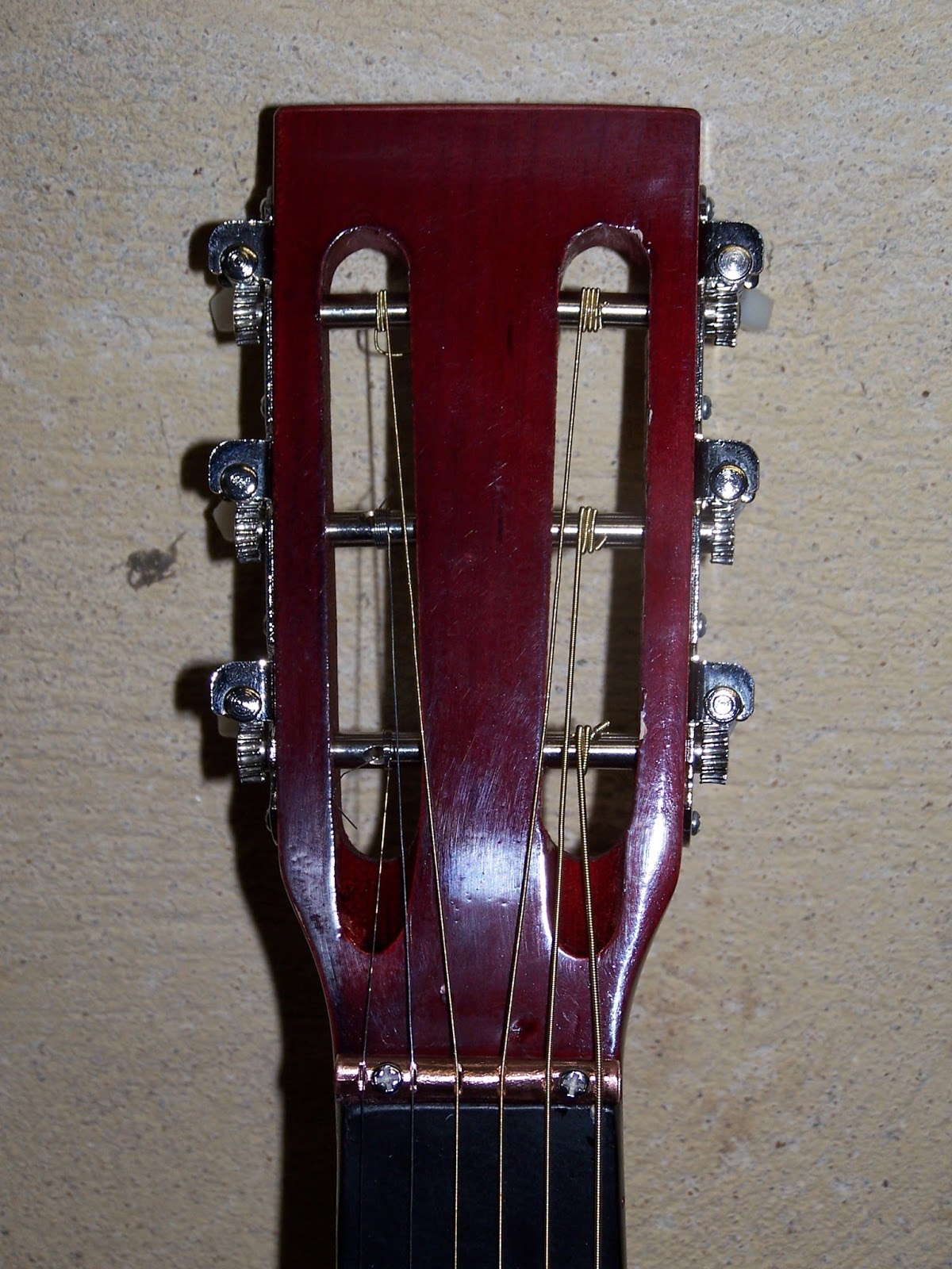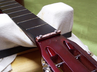 Le sillet en cuivre poli et vissé à sa place,prêt à recevoir de nouvelles cordes acier extra light ...