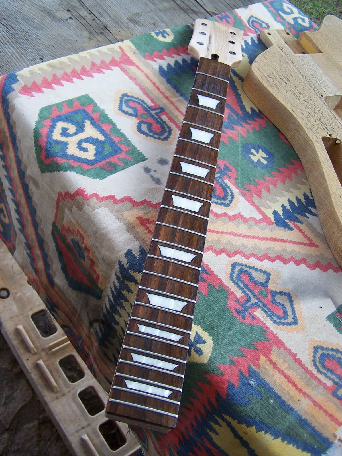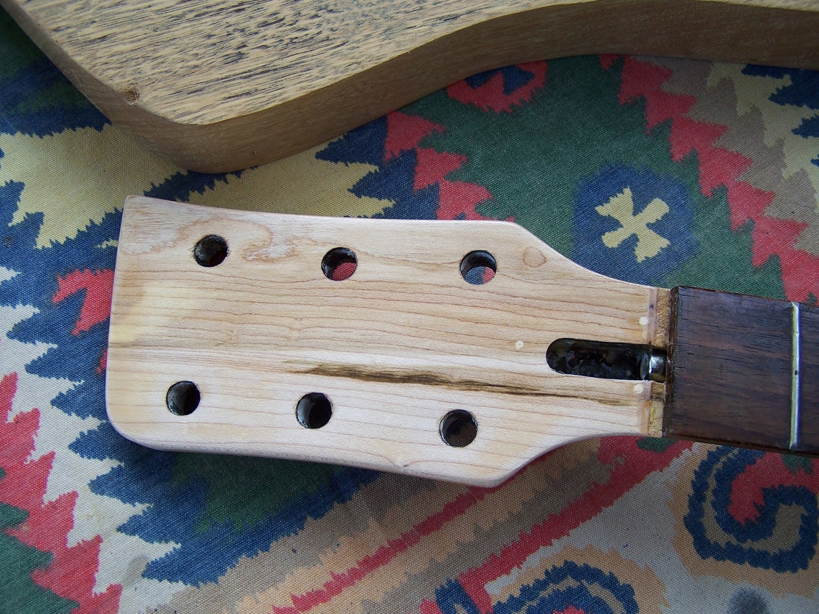 Ce sera le manche du projet .Je l'ai acheté d'occaz sur le net ,il était tout noir et j'en ai bien bavé pour enlever ce foutu vernis chinois et surtout son satané mastic de m... Il restera couleur naturel vernie .La tête a été retaillée ,les frettes sont pas mal , j'ai du repercé les trous de fixation ,et un cache truss-rod maison est en fabrication ...