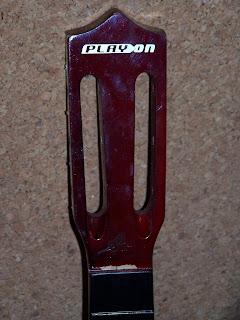 Et pour finir,la tête de la Miss,copie "open book" de chez Gibson,avec son cache truss-rod,son gros logo Sakura,et ses mécaniques à bain d'huile "Ping" plutôt bof ... Allez zou,au boulot !!!
