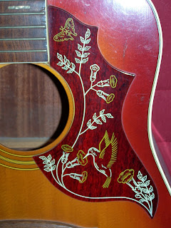 Ici,on voit de prés l'original pickguard fleuri,avec son colibri butineur et papillon ...