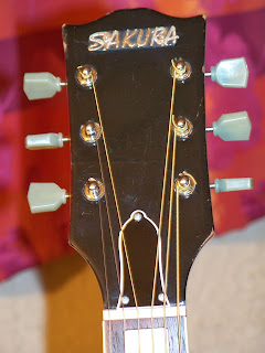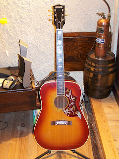 Et voilà,parti pour acheter une guitare pas chère pour trimballer de partout,je me retrouve nez à nez avec une copie vintage et fidèle de "Gibson Hummingbird" par Sakura-made in japan.