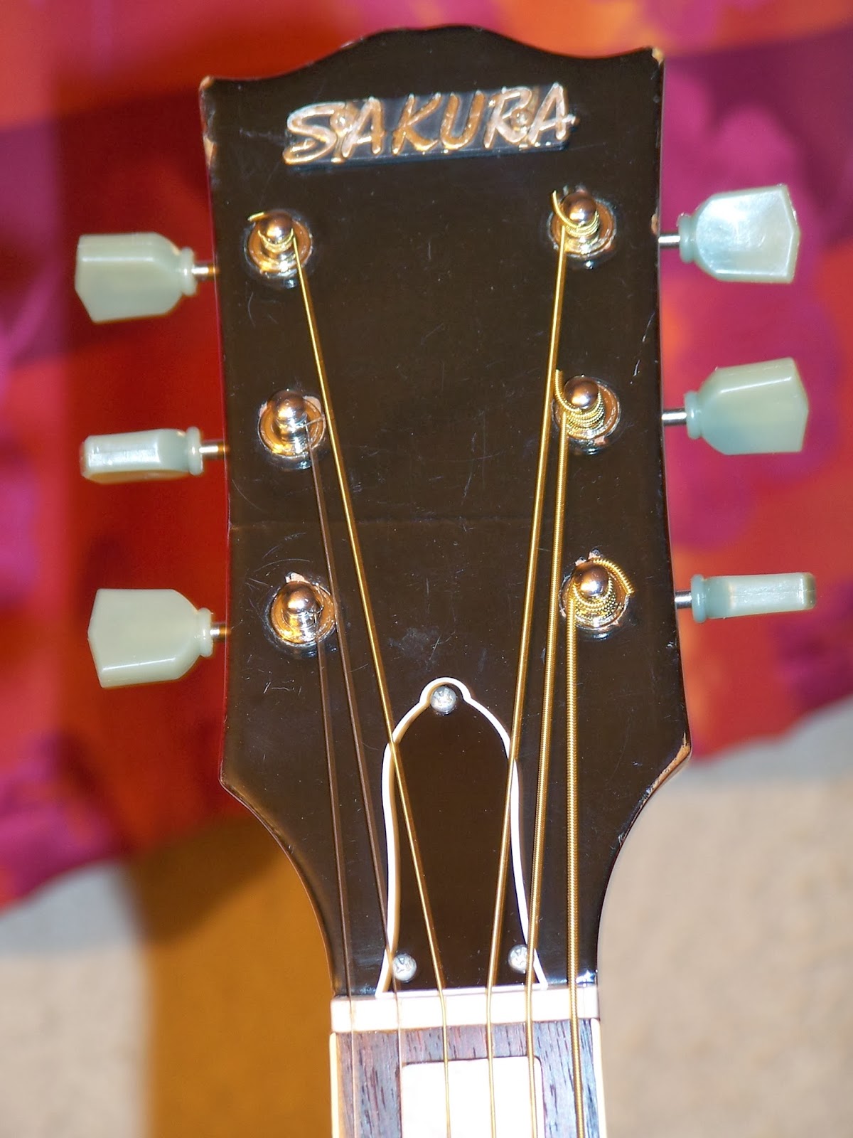 On la voit ici avec sa jolie teinte cherry-sunburst,son chevalet réglable et inversé,son joli pickguard avec le colibri copier-coller de chez Gibson,sa tête aussi fidèlement répliquée,le gros logo Sakura,et ses mécaniques un peu pourries...