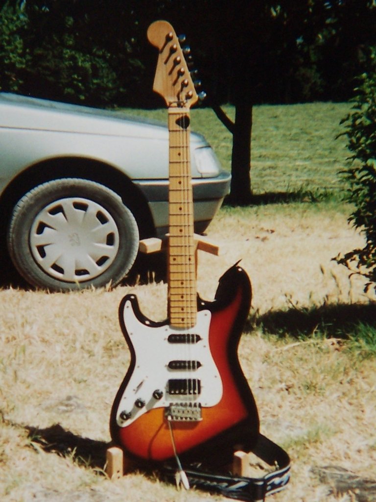 C'était une copie de stratocaster Fender pour gaucher,trois simples micros avec aimants collés bien pourris,corps sunburst en contreplaqué bien pourri aussi,manche épais avec touche érable (?),mécaniques vintages,et tout l'attirail de la strat de base (boutons blancs,capots de micros blancs,sélecteur blanc,pickguard blanc 3 plis,vibrato vintage...)et de la pelle de débutant pas trop chère.