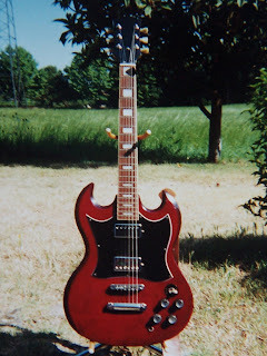 Gros démontage donc,et nettoyage,huilage de la touche du manche,changement de certaines vis,greffe de deux bons gros micros:un humbucker "Gibson 57 Classic" en position manche,et un double "Dimarzio DP100" céramique de l'époque en position chevalet (qui saturait méchant...),révision de l'électronique avec câblage et montage d'un switch trois positions,changement et réglage de chevalet avec celui d'une Les Paul,ajout de la rondelle noire "rythm/treble" du sélecteur,quatre jolis boutons noir et chromés de SG,et ça va mieux.Les mécaniques vintage étaient des copies fidèles des Kluson "tulipes",la tête du manche idem à la forme des Gibson originales,le cache truss-rod en forme de cloche mais sans marquage,et le corps était en bois contreplaqué...Encore une anecdote:je venais juste de finir de la briquer 1000 fois quand elle m'échappa et tomba par terre.Bilan:un joli poc,et un tube de vernis à ongle "Bordeau" pour rattrapper le coup.Comme quoi,à trop vouloir bien faire...J'ai fini par la vendre à un jeunot à qui je donnais des cours de guitare débutant,en gardant pour moi les fameux micros,et les strap-locks Schaller.ça devait être en 1999,mais je sais pas pourquoi,j'en rachèterai une un jour...