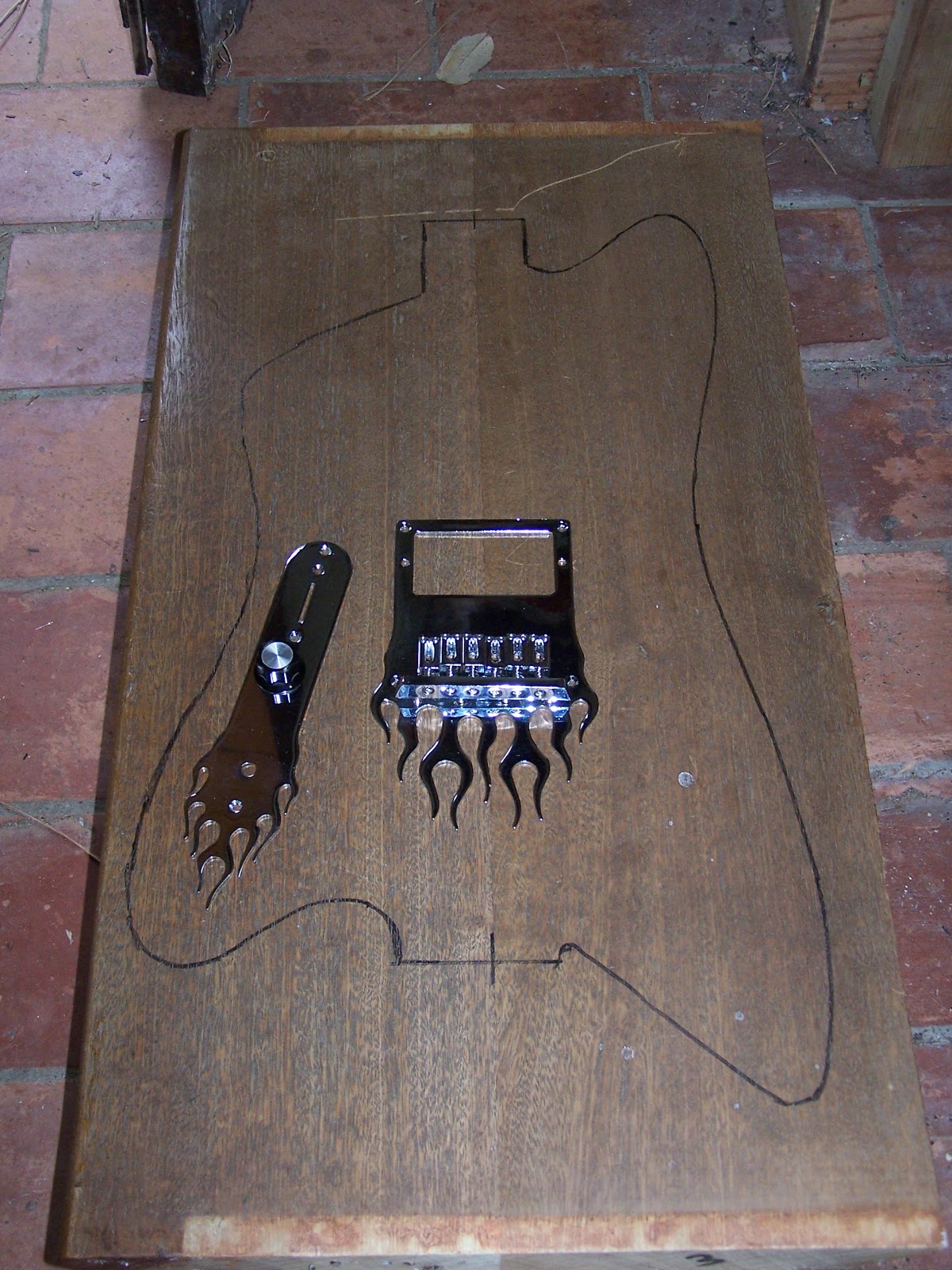 En bricolant à la maison,et en changeant l'escalier de la mézzanine,j'ai pu récupérer une marche en bois rouge exotique bien sec (acajou,sipo,???),qui sera parfaite pour le corps de ma future pelle.Ici,on voit le traçage du corps sur la planche,avec l'accastillage en place,posé provisoirement pour la photo...